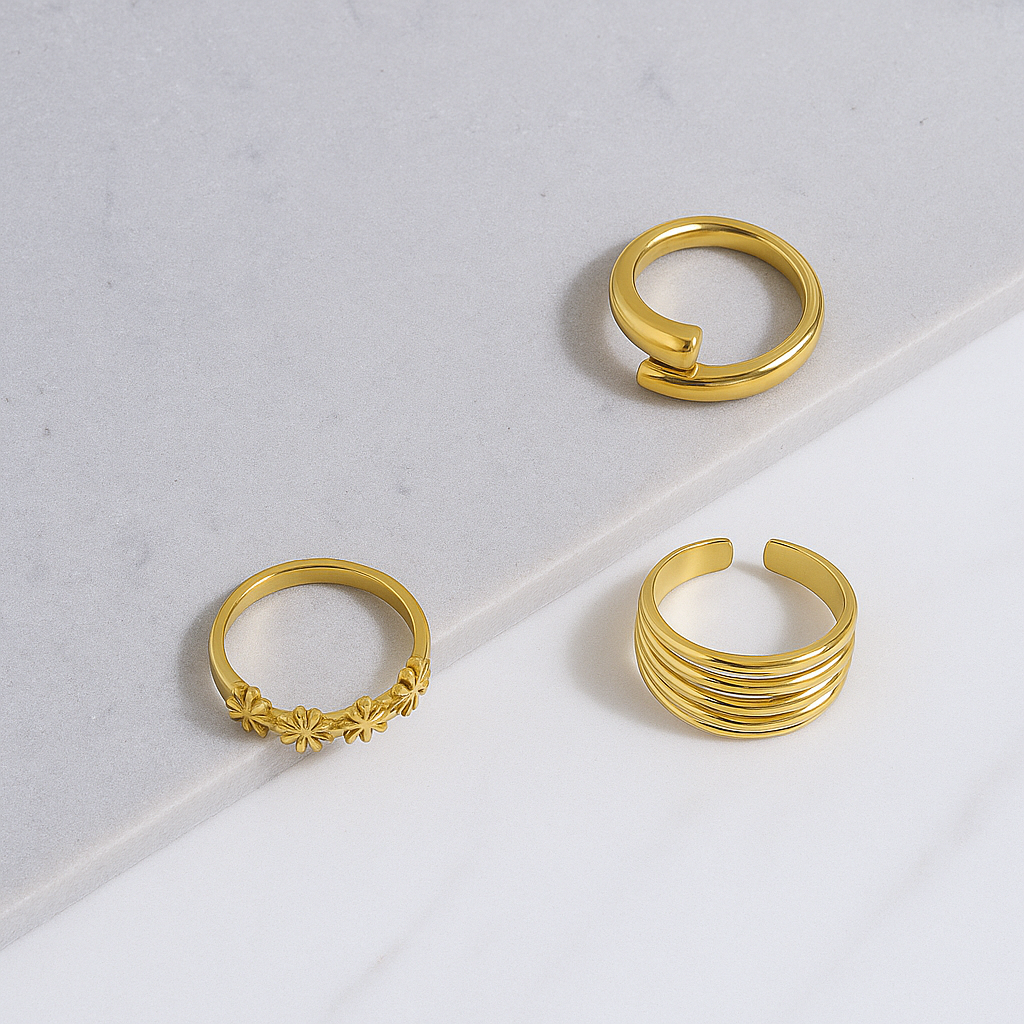 Oplev vores kollektion af guldbelagte ringe i rustfrit stål – designet i en tidløs nordisk stil.