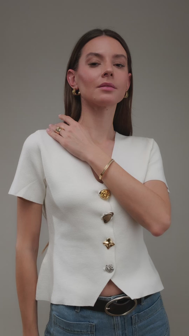 En eksklusiv bangle i guldbelagt stål, der kombinerer klassisk elegance med moderne nordisk design. Selja Banglen har en side prydet med glimtende zirkonia-sten og en anden med elegant riflet mønster – et smykke, der fanger lyset fra alle vinkler.