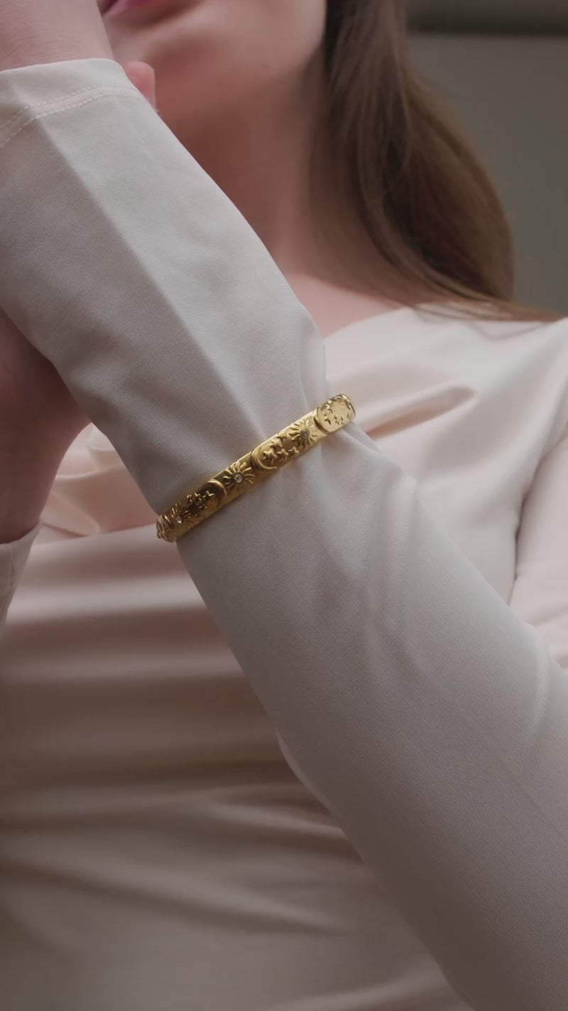Et elegant og iøjnefaldende armbånd i guldbelagt rustfrit stål, dekoreret med smukke solmotiver og fine zirkonia-sten. Det åbne design og de detaljerede graveringer giver armbåndet et eksklusivt, boheme-inspireret udtryk med et strejf af luksus.